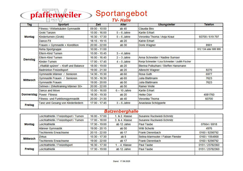 Angebot für Kurse des TV-Pfaffenweiler gilt nur für Vereinsmitglieder | eine zusätzliche Anmeldung zu den einzelnen Kursen ist nicht erforderlich und der Einstieg jederzeit möglich.